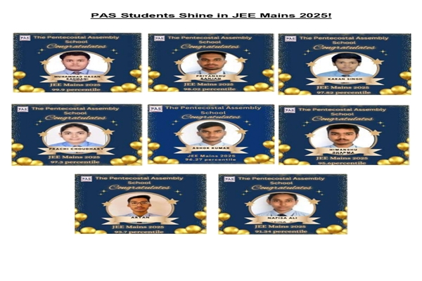 12th February, Bokaro: The Pentecostal Assembly School proudly celebrates its students’ stellar performance in JEE Mains 2025. Leading the achievers is Priyanshu Ranjan (98.02),